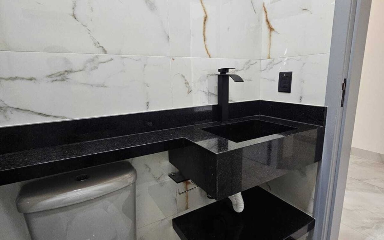 - Banheiros com chuveiros, box blindex fumê e bancadas em granito São Gabriel